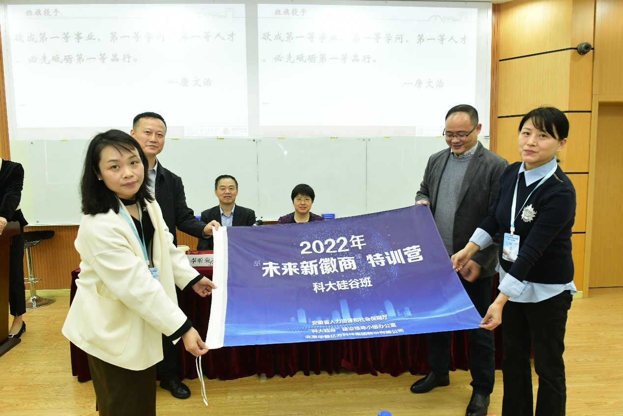 陈宏、周登明、李昕荣等领导为班级颁发班旗。班旗交接,文化传承,这一面班旗代表的是领导对于同学们的关注与重视,是老师对于同学们的期望与信心。思源致远,接过班旗,即意味着本次2022年“未来新徽商”特训营科大硅谷班正式成立。