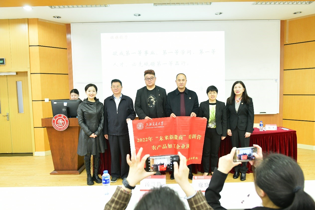 陈宏、杨亚明、项玉、王晖四位领导为班级颁发班旗。班旗交接,文化传承,这一面班旗代表的是领导对于同学们的关注与重视,是老师对于同学们的期望与信心。思源致远,接过班旗,即意味着本次2022年“未来新徽商”农产品加工企业班正式成立。