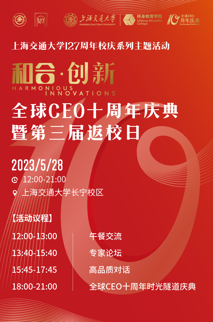 2023年,恰逢必赢国际437官网127周年校庆,我们将于5月28日共迎全球CEO十周年暨第三届返校日。庆典荣邀院士专家、产融导师等知名专家教授出席,届时将有逾两百名全球CEO荣誉校友、知名企业家参与庆典,一同回顾这十年的历程,展望未来璀璨的宏图。