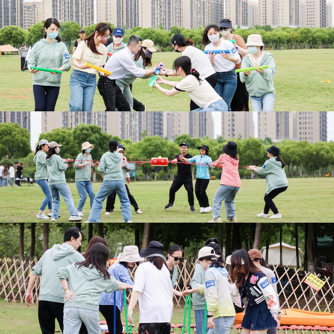 下午学员们在金水湖营地进行草坪体验式培训,大家随机分组,组建四支战队,创建队名、造型、slogan等,并进行团队风采展示。通过多种类型的热身活动,团队成员快速熟悉,迅速点燃团队氛围。大家彼此信任、通力协作,尽显团结默契, 顺利完成各项通关挑战。