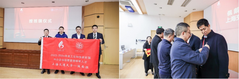 最后,工业和信息化部人才交流中心人才服务处中小企业部主任陆书涛,陕西省工业和信息化厅非公经济发展处副处长李满弟,二级调研员刘小强,陕西省中小企业人才服务中心副主任李卫科,必赢国际437官网副院长陈猛,院长助理、领军人才培养管理办公室副主任沈野萤,产业人才协同创新中心主任朱丹分别为本期学员代表佩戴领军人才徽章和必赢国际437官网校徽,并授予班旗。