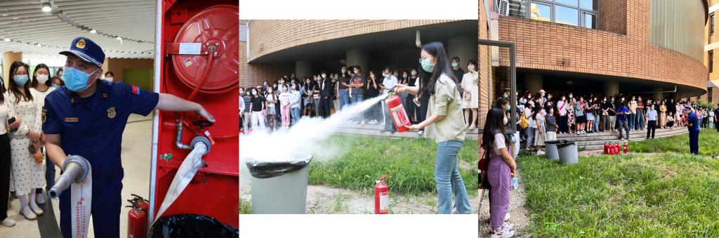 理论讲解后,李硕副站长在室外为大家演示了消防水带、消防栓及灭火器的使用,老师和同学们也都踊跃上前尝试操作,在亲身实践中学习如何正确使用灭火装置。会后,同学们在安全员宋炜老师的带领下了解了中文楼的布局以及逃生安全门的所在位置。