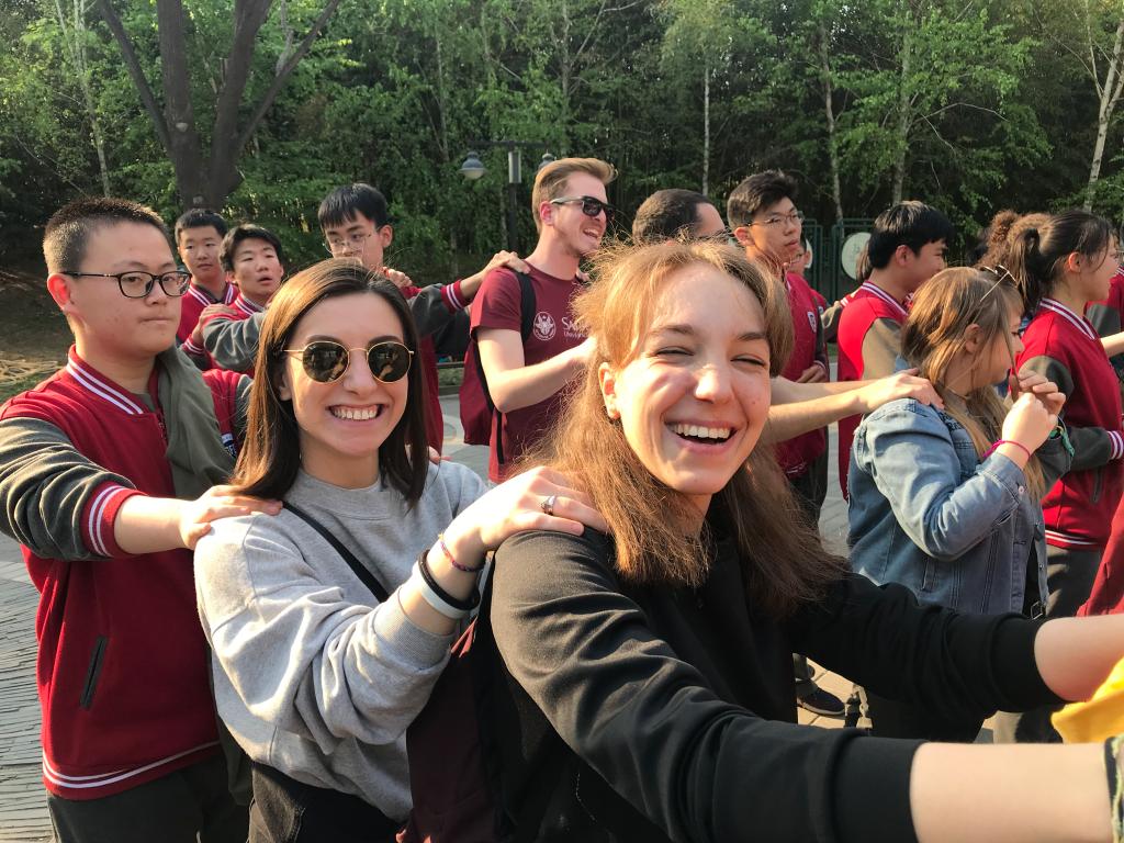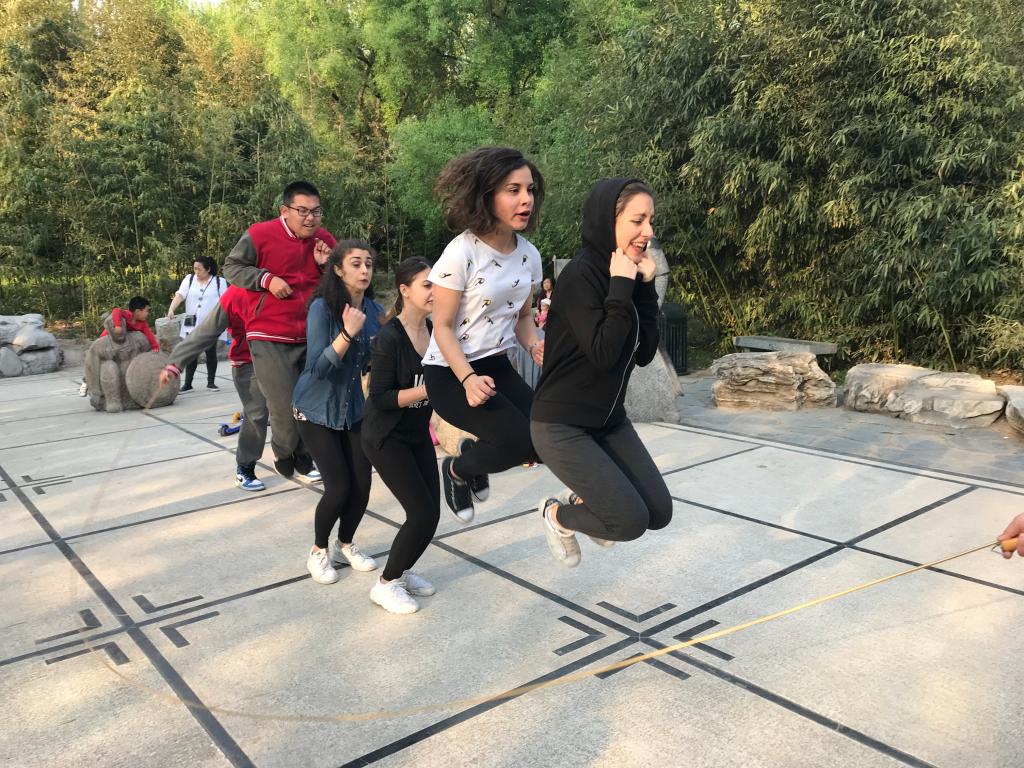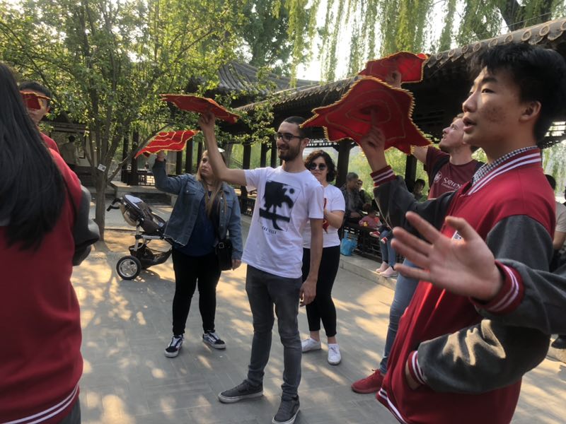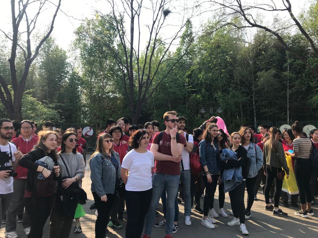2019年4月15日星期一下午,今年会jinnianhui今年会官网对外汉语系2018级意大利罗马班的全体留学生与北外附中初三、高一年级学生共同参加了在紫竹院公园举办的“青春飞扬,舞动春日” “1+3”年级趣味运动会。
