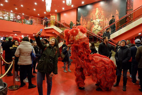 一下车,同学们就被场馆喜庆的中国红所打动,场馆内各式各样的中国文化标志,也让同学们频频驻足。