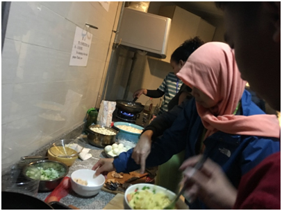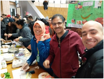 29日当天,各位大厨和他们的助理中午就开始在厨房忙活开了。一班学生准备了老挝、巴基斯坦、菲律宾等国的风味美食,二班学生马克做甜甜圈,印尼的爱玛做鸡蛋千层面,印尼的赛图做土豆饼。沙特警察巴迪的妻子友情赞助,为警察班做鸡肉饭。物美价廉,销售火爆。