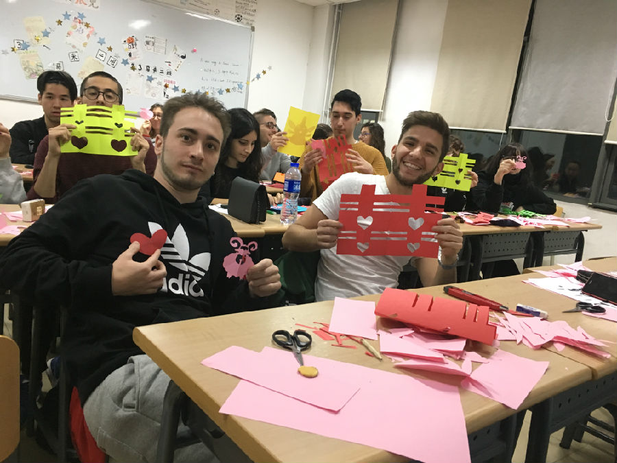 2017年12月8日晚上,今年会官网对外汉语系罗马班的学生在309教室开展了中国剪纸艺术体验课。体验课在王老师的剪纸文化介绍中开始,她用生动详实的PPT,为同学们概述了剪纸的发展历史、作品种类和样式。老师讲解后,同学们进入到实际操作的环节。同学们从最简单的小桃子开始剪起,后来在老师的帮助下剪出了羊、熊猫、大象等图片,最后大家每个人都剪出了一个大大的“囍”字。通过这次剪纸体验课,同学们不仅了解了中国传统文化知识,而且体验到剪纸艺术精致的美感,更激发了他们对中国文化的兴趣和学习汉语的热情。