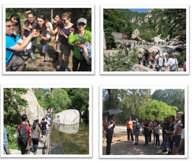 经过一个半小时的车程,师生一行到达了碓臼峪风景区,学生们在导游的带领下进入景区。郊区的自然风光吸引了众多留学生驻足留念。游览过程中大家也认识了不少新朋友,一路上充满了欢声笑语。景区参观结束后,学生和老师在景区山脚下的露天餐厅享受了一顿丰盛而别具特色的农家饭,大家吃得津津有味。行李收拾妥当后,经过短暂的休息,留学生们在带队老师的指导下进入不同的农户家开始进行语言实践任务,他们向农户询问了生活、儿女、工作等方面的问题,学生和农户交谈甚欢。访谈结束后,学生们在导游和老师们的带领下游览了当地的自然风光,尝樱桃、喝泉水、做游戏、放飞自我。晚饭结束后,是自由活动的时间。在凉爽的晚风中,有的同学弹着吉他唱着歌,有的同学和新认识的朋友愉快地交谈,有的同学和老师交流着在北京的学习和生活。娱乐活动结束后,大家互道了晚安,为第二天的活动养精蓄锐。