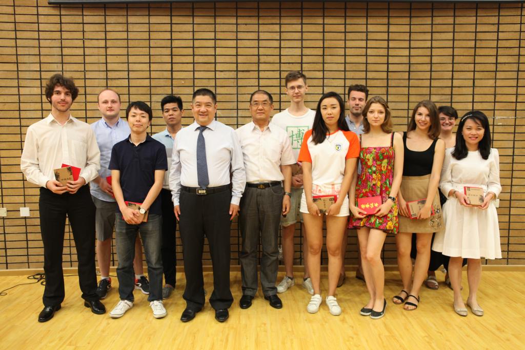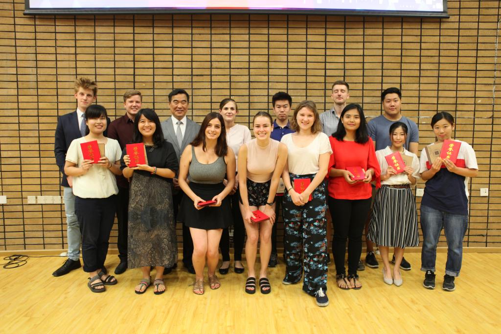 典礼举行了颁奖仪式,分别表彰“优秀学生”、“好班长”和“全勤生”。汉语培训中心进修部魏瑞明同学和他的三位队友参加了“2018年北京外国留学生汉语辩论邀请赛” ,最终今年会jinnianhui代表队突破重围获得总冠军。借此结业典礼的机会,今年会官网刘厚广书记为最佳辩手魏明瑞同学颁奖,陈小明副院长为参加“2018在京外国留学生‘我与北京’主题征文比赛”并获得二等奖、三等奖以及优秀奖的学生颁奖。
