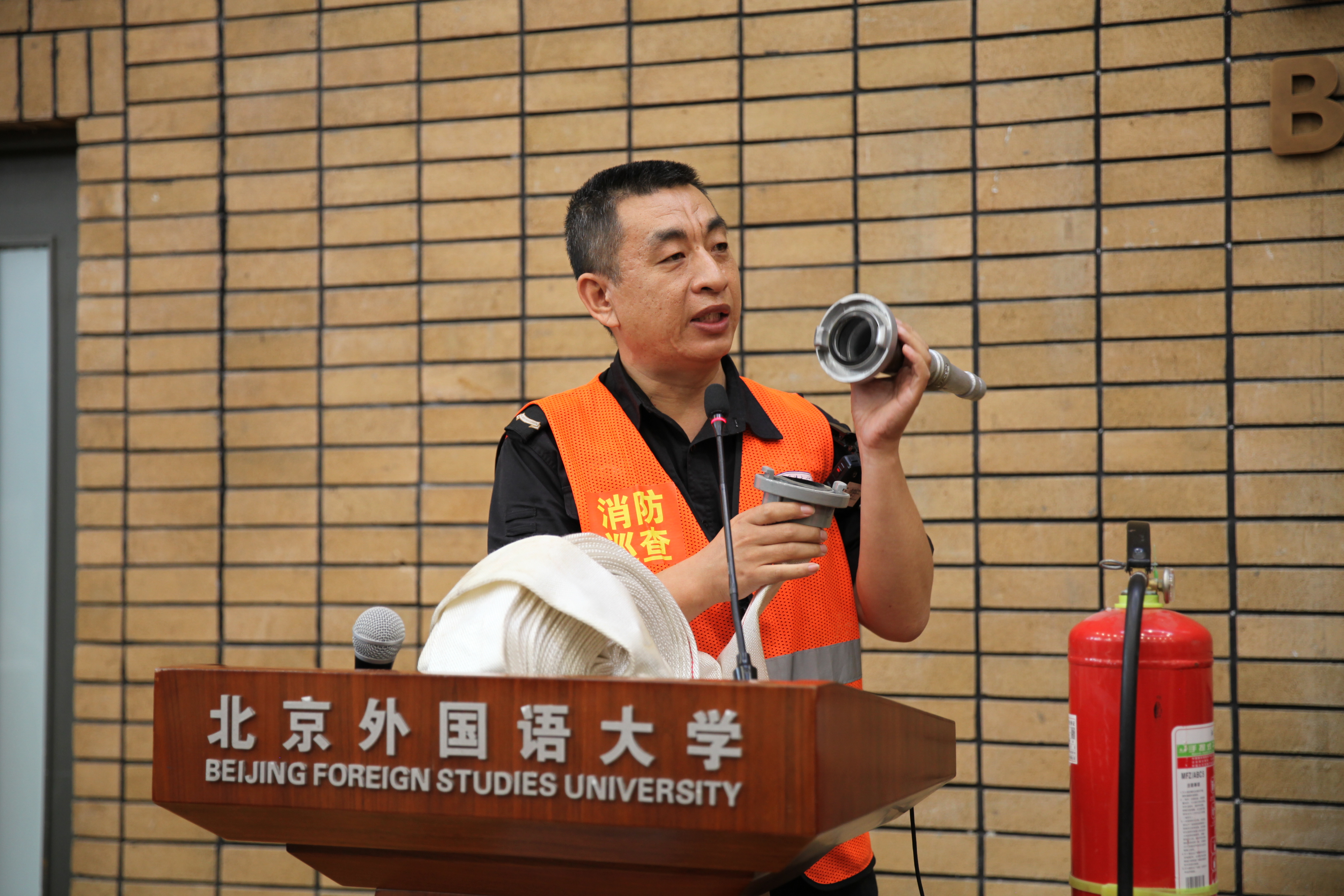 接着,杨花亮站长为同学们详细讲解了灭火器、消防栓的使用方法、使用期限以及二者区别。随后,杨站长用实物为同学们展示不同消防器材的具体使用方法。同学们与杨站长就消防安全的问题积极互动,增强了自身的消防安全意识。