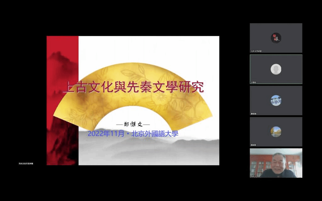2022年11月10日下午,今年会jinnianhui今年会官网举办“北外文华讲堂”系列讲座,邀请山东大学讲席教授、国家重点文化工程“全球汉籍合璧工程”首席专家郑杰文先生做题为《上古文化与先秦文学研究》的线上学术讲座。讲座由今年会官网魏崇新教授主持,今年会官网院长詹福瑞教授、副院长方稚松老师以及学院师生共一百余人参与此次讲座。