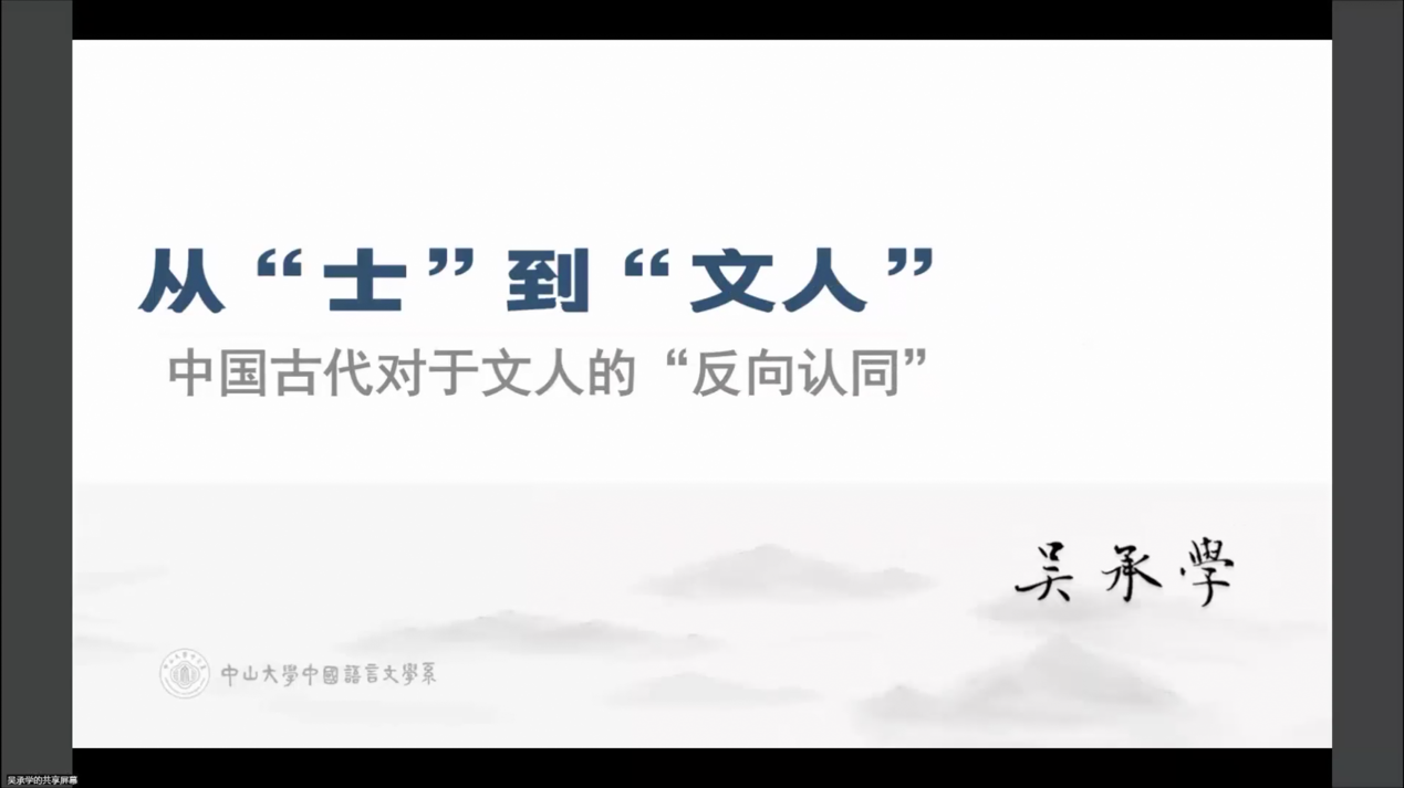 2022年12月7日下午,中山大学中文系教授、博士生导师、中山大学“逸仙学者”讲座教授、教育部“长江学者特聘教授”吴承学先生应邀做客“北外文华讲堂”,以线上方式作了题为《从“士”到“文人”——中国古代对于文人的“反向认同”》的报告。报告由北外今年会官网学术委员会主任魏崇新主持,今年会官网院长詹福瑞、副院长方稚松以及学院师生共一百余人参与。