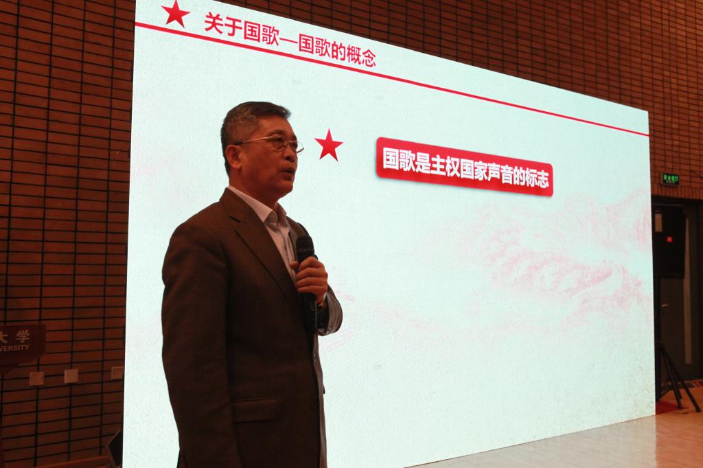 于海老师的讲座赢得师生强烈共鸣。在“唱响我们的国歌,热爱伟大的祖国”的号召下,于海老师亲自指挥,师生全体起立,饱含真挚情感,唱响《中华人民共和国国歌》。