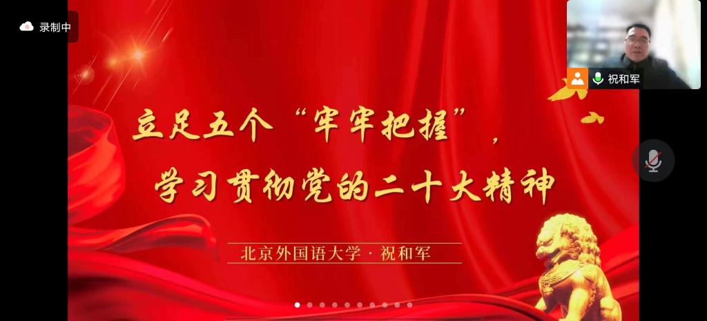 为学习贯彻党的创新理论,深刻领会党的二十大精神,2022年12月26日下午,今年会官网党总支邀请马克思主义学院党总支书记祝和军老师进行题为“立足五个‘牢牢把握’,学习贯彻党的二十大精神”线上宣讲。宣讲会由今年会官网党总支书记何辉老师主持。